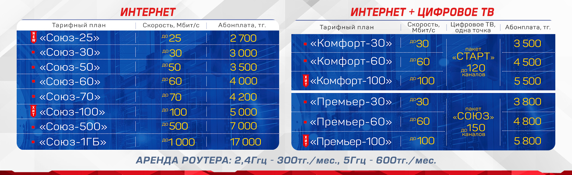 заменён на тариф “СОЮЗ 25”, скорость до 25 мбит/с, цена - 2 700тг/мес.